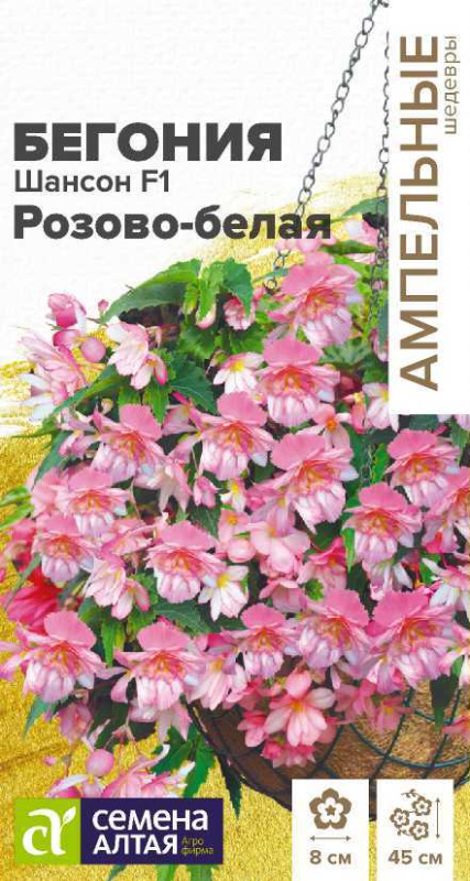 Ампельная бегония, формирует длинные побеги, усыпанные по всей длине крупными махровыми белыми с розовой каймой цветками камелиевидной формы. Растение хорошо ветвится, образуя 5-8 ниспадающих побегов. Неприхотлива в уходе. Отлично подходит для подвесных корзин, вазонов, высоких кашпо и балконных ящиков.