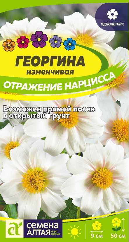 Декоративный однолетник, радующий все лето эффектным цветением. Растение ветвистое высотой 40-50 см. Крупные белые с желтым глазком простые соцветия, 8-9 см в диаметре, вызывают восторг и восхищение своей элегантностью и красотой. Георгина незаменима в парадных цветниках, миксбордерах и группах второго плана, используется для создания бордюров, ярких клумб и рабаток, её с успехом выращивают в кашпо, вазонах, оконных и балконных ящиках.