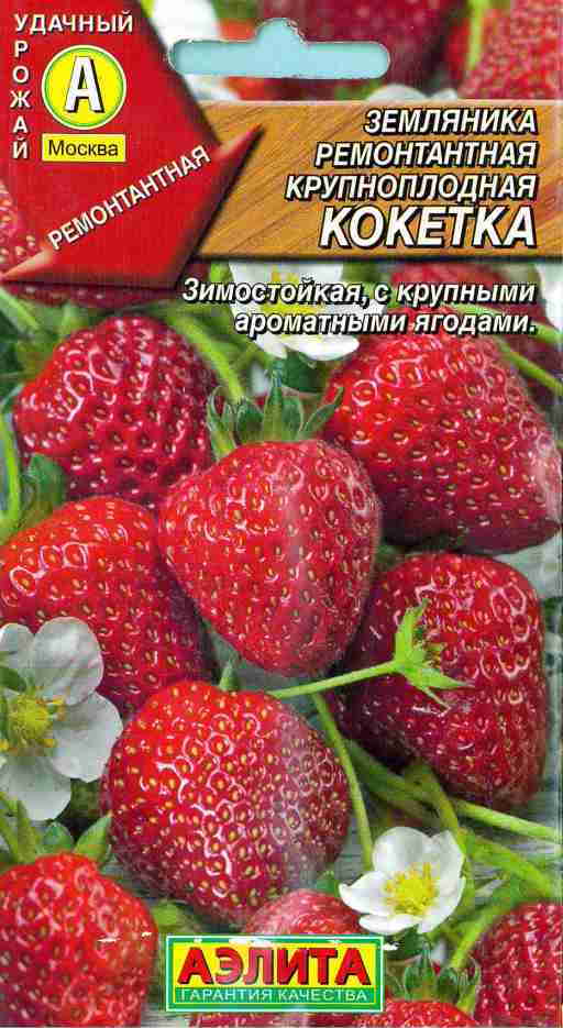 Посадите в своем саду раннеспелую землянику Кокетка, и вы сможете вдоволь полакомиться бесподобными сладкими ароматными ягодами. Сорт зимостойкий, ремонтантный, в отличие от обычной садовой земляники цветет непрерывно и очень долго плодоносит: в средней полосе до трех, а на юге — до четырех-пяти месяцев. Ягоды очень красивые, крупные, массой до 25 г, красные, из них получатся изумительные десерты, джем, варенье и ликёр. Ягоды подходят для замораживания.