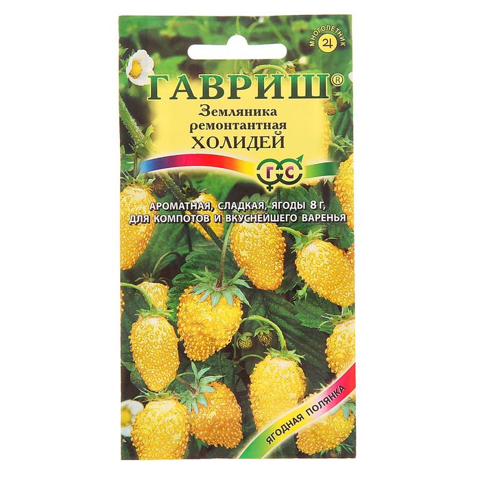 Ремонтантная земляника. Ягоды желтого цвета, среднего размера, яйцевидной формы, очень ароматные, сладкие, великолепного вкуса. Вкуснее и ароматнее красноплодных сортов. Совершенно не образует усов. Формирует растения высотой 25-30 см. Отлично растет в любом регионе. Предпочитает открытые, солнечные участки. Сорт урожайный, зимостойкий. Может выращиваться как декоративная горшечная культура.