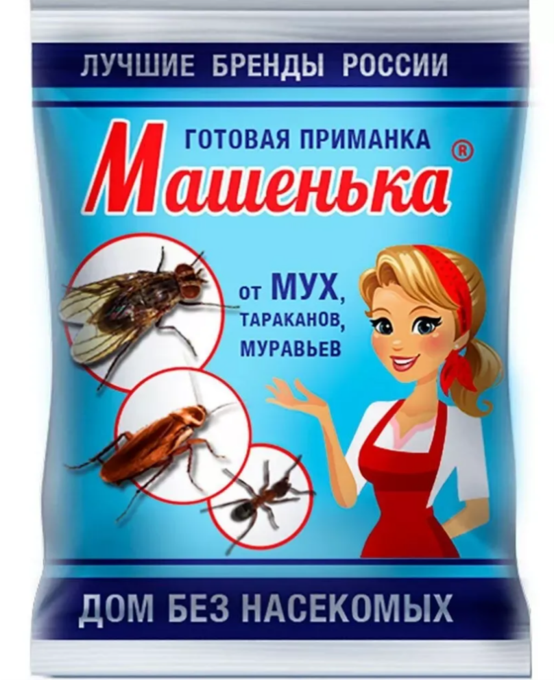 Инсектицидное средство Машенька - готовая приманка с пищевыми привлекантами для уничтожения мух, тараканов, домовых и садовых муравьев и других насекомых. Действие приманки начинается через 10 минут после раскладки и сохраняется в течение 2 месяцев. Специальный горький компонент (битрекс) исключает поедание приманки животными и птицами