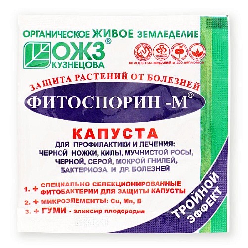Биофунгицид, в основе которого – отселектированные, отобранные природные фитобактерии от болезней капусты и крестоцветных в споровой форме, проникающие в ткани растений и вырабатывающие биологически активные вещества для их защиты и стимуляции. Защищает от чёрной ножки, килы, мучнистой росы, чёрной, серой, мокрой гнилей, бактериоза и других болезней капустных культур.