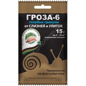 Средство контактно-кишечного действия Гроза-6 в гранулах используется в качестве приманки для борьбы с улитками, слизнями на овощных, плодовых, цитрусовых, ягодных культурах, цветах, винограде. Готов к применению. Разрешено для экологического земледелия (безопасен для дождевых червей и полезных насекомых). Простое применение - гранулы просто рассыпаются на поверхности почвы.