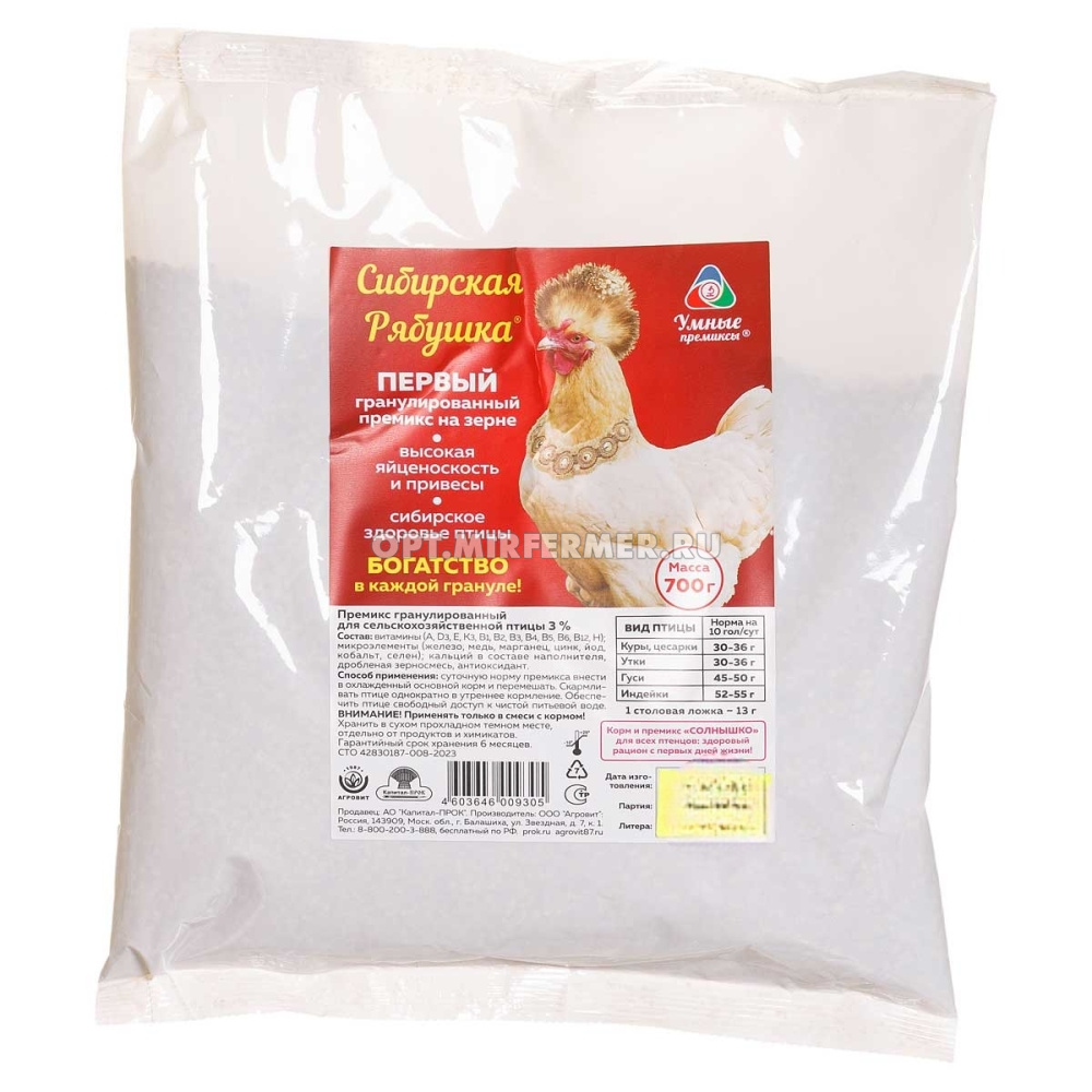 Первый гранулированный премикс на зерне для сельскохозяйственной птицы. Специально разработан для ускорения и облегчения процесса кормления птицы на подворьях и в фермерских хозяйствах. Премикс имеет форму плотных гранул размером до 2,5мм, легко смешивается с сухими и влажными мешанками и имеет богатый состав. Преимущества: