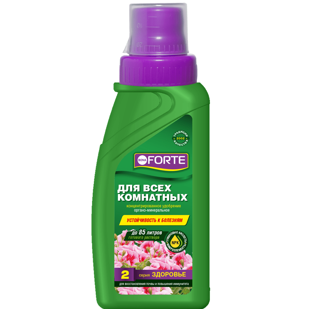 Серия ЗДОРОВЬЕ создана лабораториями Bona Forte для восстановления истощенной почвы и повышения иммунитета растений.Подходит для диффенбахии, драцены, замиокулькаса, маранты, монстеры, плюща, сансевиерии, фатсии, фикусов, филодендрона, антуриума, бальзамина, бегонии, гардении, герани, гибискуса, камелии, кливии, спатифиллума, фиалки, фуксии, хойи, цикламена, юкки и многих других. Здоровье – первый и основной шаг к красоте декоративных растений. Удобрение содержит полный комплекс веществ, необходимых для полноценного и сбалансированного питания растений.